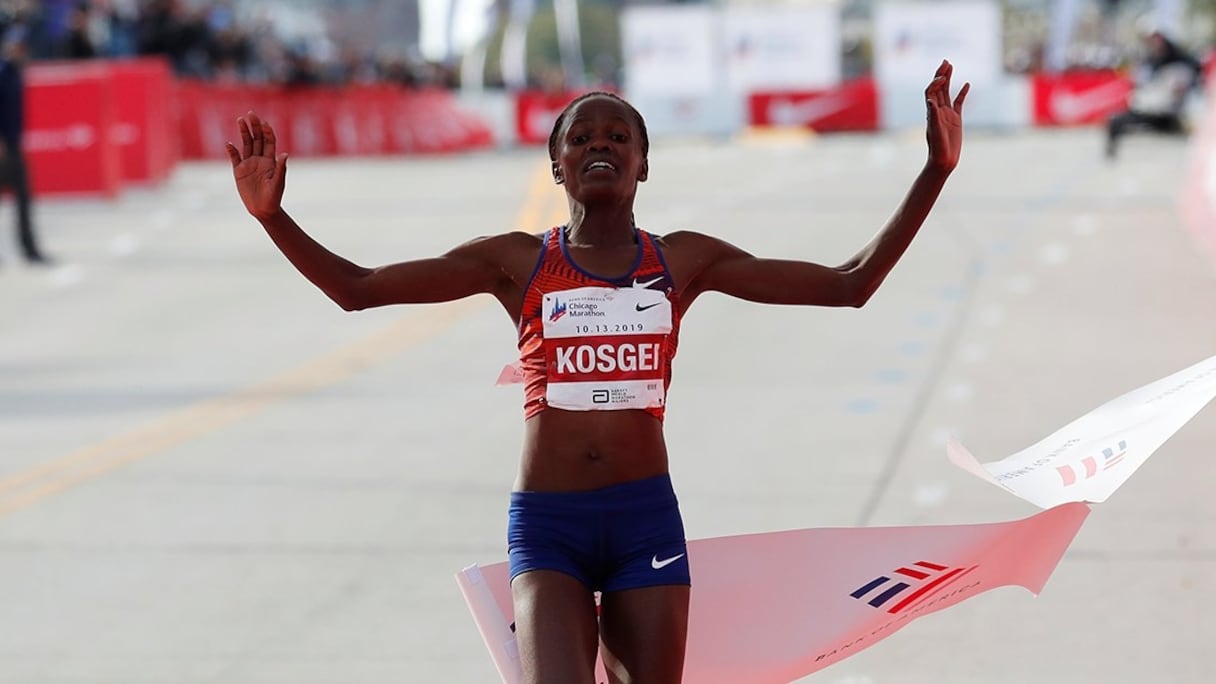 Au lendemain de l'exploit de son compatriote Eliud Kipchoge, premier homme à courir le marathon sous les deux heures (1h59 min 40 sec) dans des conditions non homologuées à Vienne, Brigid Kosgei, 25 ans, enlève 1 minute et 21 secondes au précédent record, établi par Paula Radcliffe le 13 avril 2003 à Londres.
