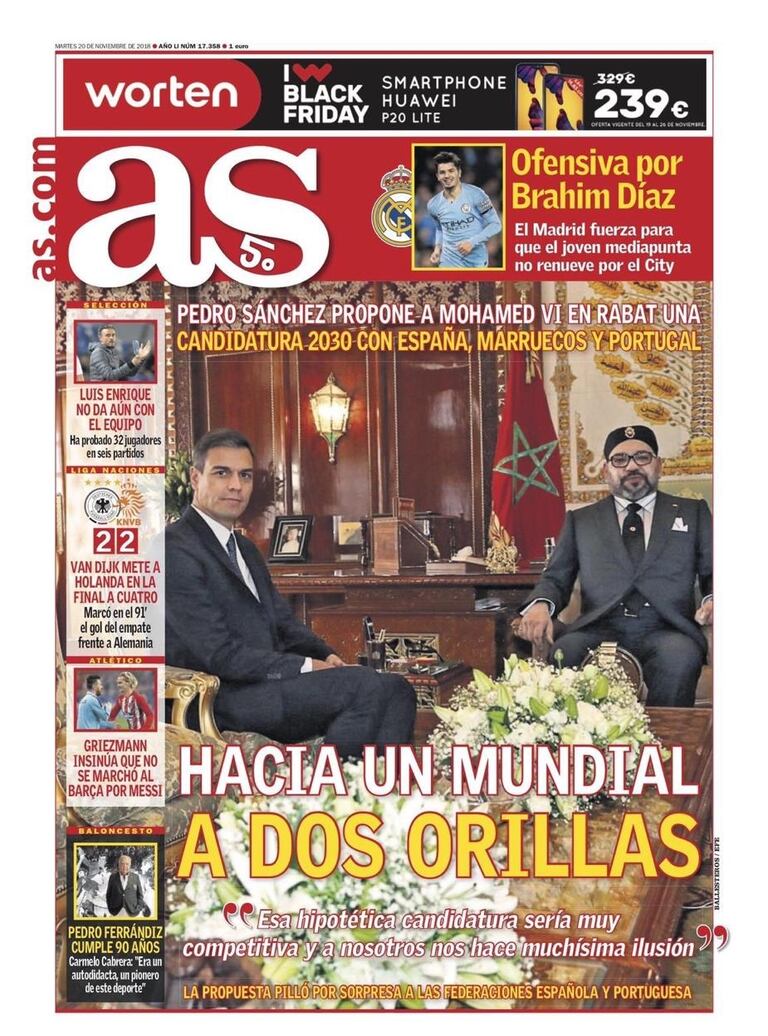 Dans son édition de ce mardi, le journal espagnol “AS” s’est intéressé à la question du Mondial 2030. Pour sa Une, le quotidien sportif a choisi une photo du roi Mohammed VI en compagnie du chef du gouvernement espagnol, Pedro Sanchez au palais royal de Rabat.