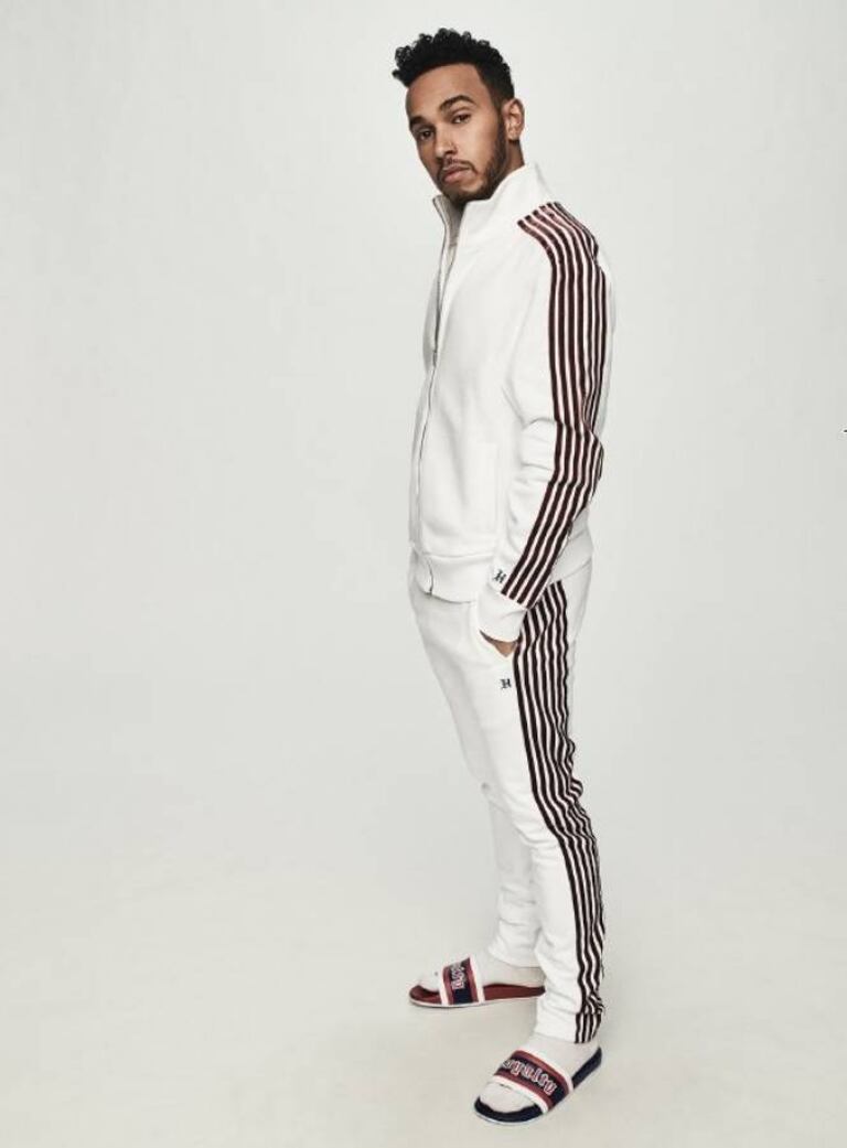 Le pilote compte lancer un large éventail de looks avec bombers satinés, survêtements, veste en jean, sneakers, boots rouges et des claquettes-chaussettes, comme le montrent ces clichés.