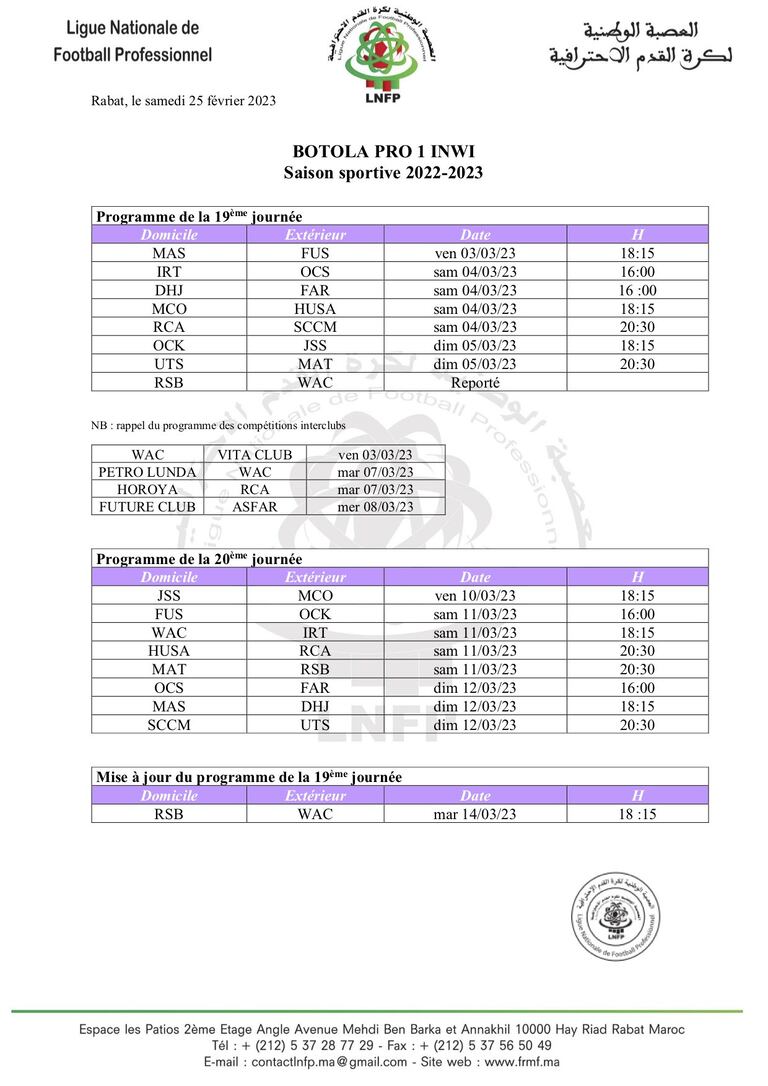 La programmation tient compte de l’engagement du Wydad de Casablanca en Ligue des champions africaine. Le match des Rouges contre la Renaissance sportive de Berkane (19e journée) et le seul qui sera reporté et sera disputé le 14 mars.