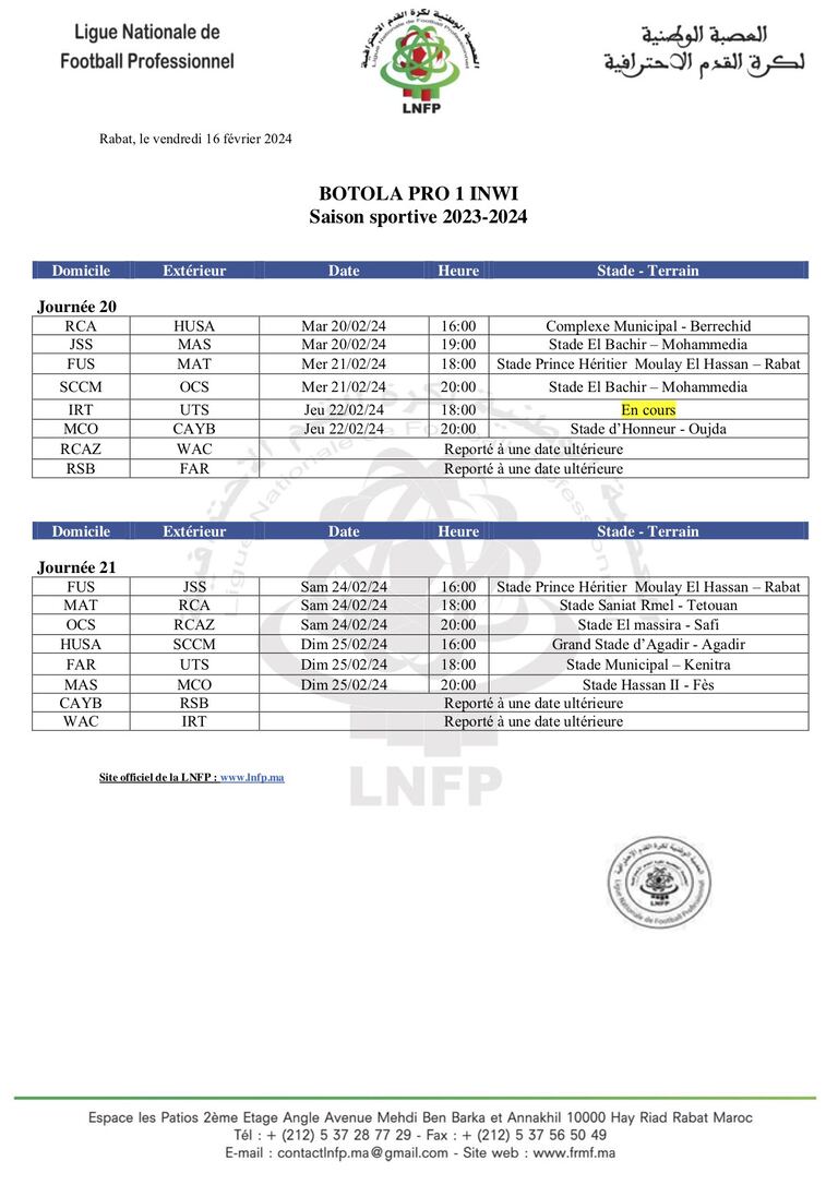 La Ligue nationale de football professionnel (LNFP) a dévoilé, dans la soirée de vendredi 16 février 2024, le programme des 20 et 21e journées de la Botola Pro D1 Inwi.
