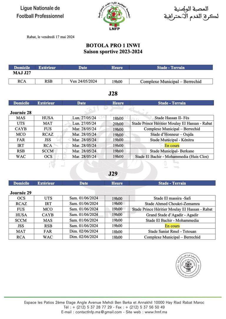 La LNFP a publié ce vendredi 17 mai 2024 le programme des 28e et 29e journée de la Botola Pro D1 Inwi, en plus du match retard qui opposera le deuxième du classement, le Raja Club Athletic, au troisième, la Renaissance Sportive de Berkane.