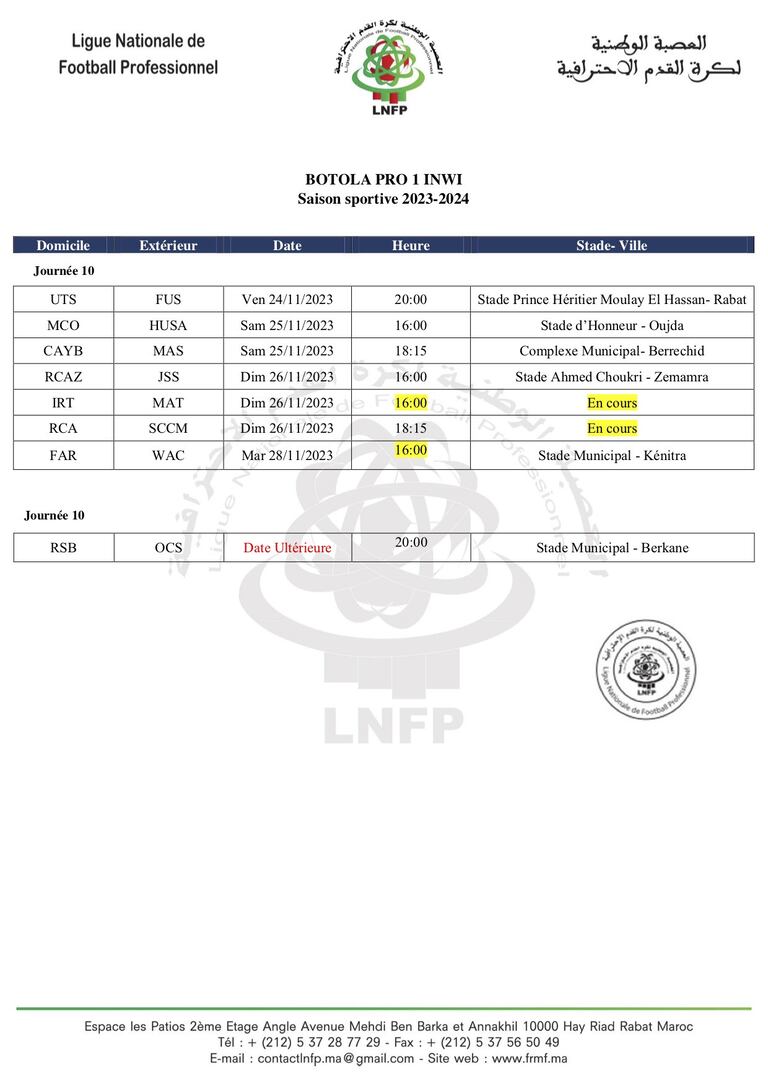 En outre, les matchs de la 10e journée de la Botola D1 seront entamés le vendredi 24 novembre avec un derby très prometteur entre l’Union Touarga Sports et le FUS de Rabat, au stade Moulay El Hassan (20h).