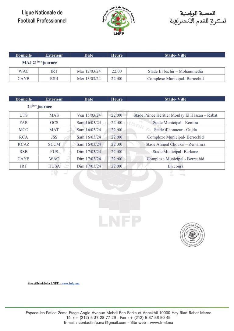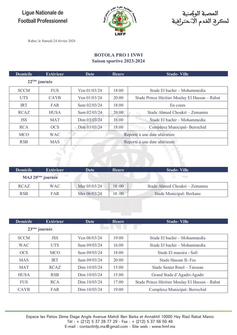 La 22e journée du championnat national de football d’élite aura lieu les vendredi, samedi et dimanche, 1er, 2 et 3 mars prochain, a annoncé la LNFP ce samedi 24 février.