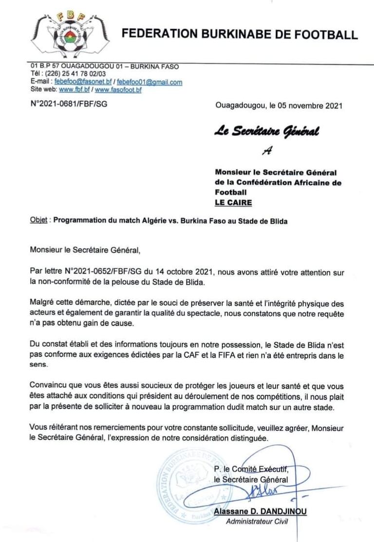 “Au regard de tous ces faits, de nature à fausser l’équité de nos compétitions, nous vous saurons gré des dispositions appropriées qu’il vous plaira de faire prendre pour la sécurité de la délégation du Burkina Faso en Algérie et surtout pour le déroulement du match dans le fair-play, l’esprit sportif, la quiétude et la préservation des chances de chacune des équipes. Convaincu de votre attachement à l’équité sportive, à la sécurité des joueurs et aux valeurs fondatrices du sport, nous savons compter sur votre soutien et votre implication pour le bon déroulement du match”, conclut la fédération burkinabé.