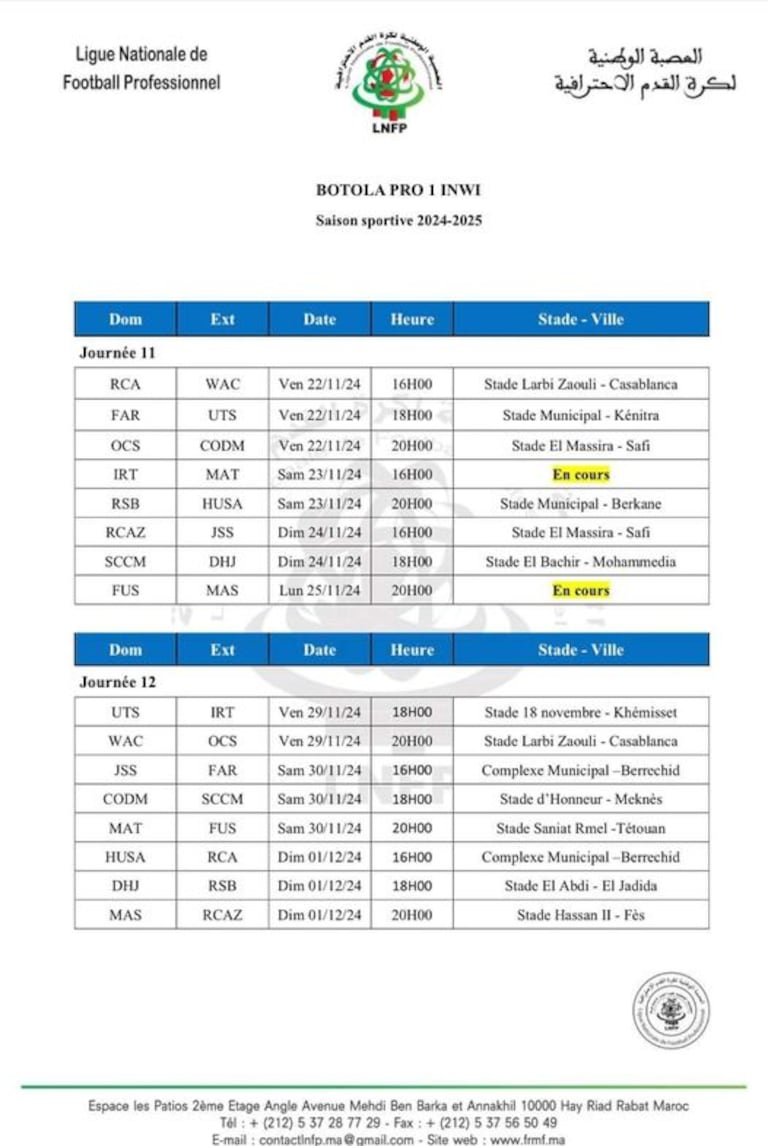 La LNFP a publié, ce dimanche 17 novembre 2024 le programme des 11e et 12e journées de la Botola Pro Inwi, avec la tête d’affiche tant attendu à savoir le derby RCA-WAC.