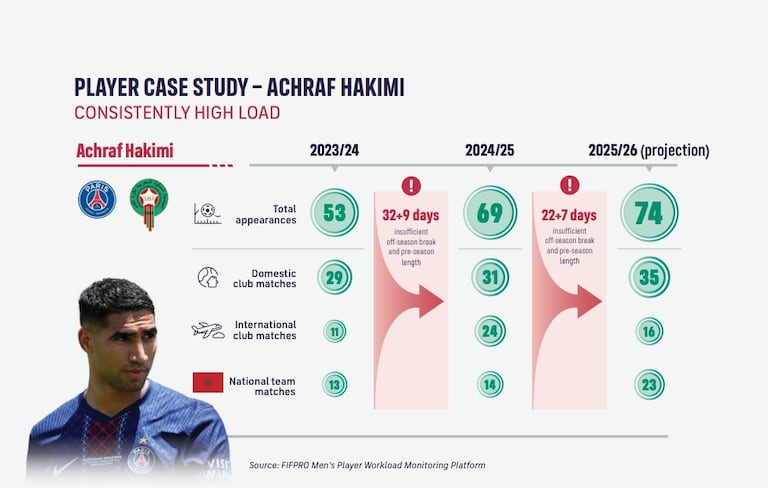 Le latéral du Paris Saint-Germain Achraf Hakimi, qui a déjà disputé 53 matches en 2023/2024, en a joué 69 la saison passée: une inflation dûe aux compétitions internationales de clubs, dont le nouveau «Mondial» joué aux Etats-Unis du 14 juin au 13 juillet.
