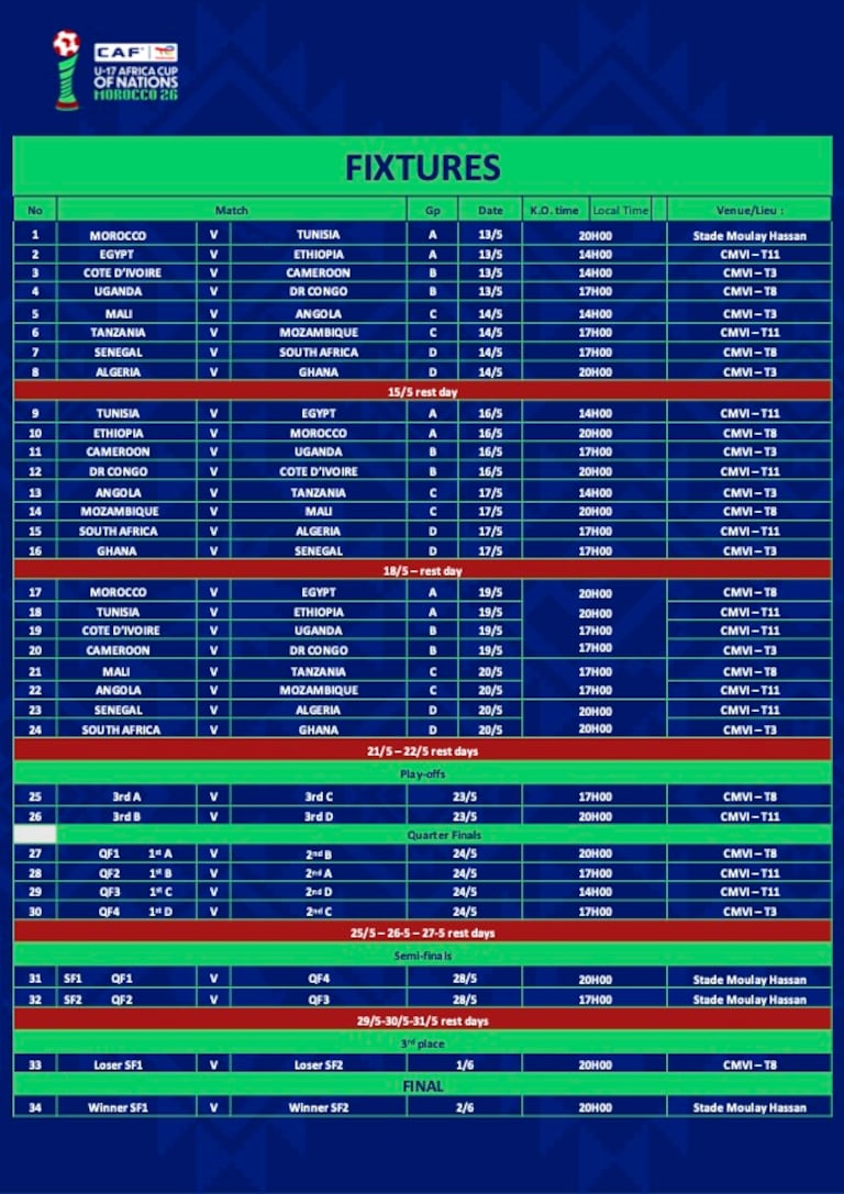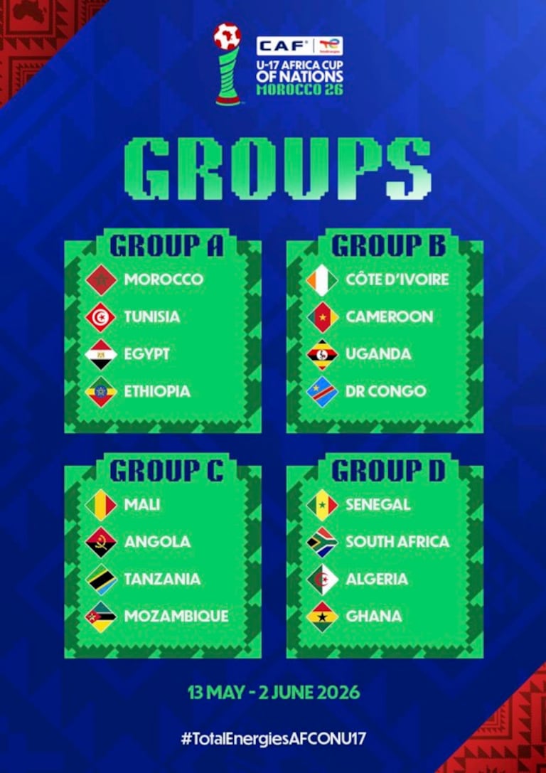 Sur le plan sportif, le tirage au sort a donné lieu à des groupes compétitifs. Le Maroc, pays hôte, évoluera dans le Groupe A avec la Tunisie, l’Égypte et l’Éthiopie. Dans le Groupe B, la Côte d’Ivoire et le Cameroun seront opposés à l’Ouganda et à la RD Congo. Le Mali, finaliste de la dernière édition, figure dans le Groupe C avec l’Angola, le Mozambique et la Tanzanie. Enfin, le Groupe D réunit le Sénégal, champion en titre, l’Afrique du Sud, l’Algérie et le Ghana.