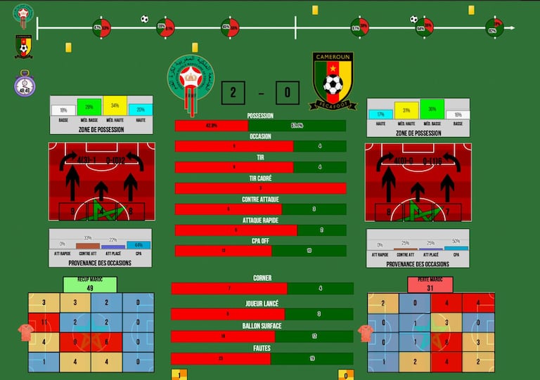 Le pressing marocain a été l’un des marqueurs forts de cette rencontre: «Le premier défenseur est (Ayoub) El Kaabi, déclencheur du pressing haut», explique l’analyste, qui insiste sur un pressing collectif «bien coordonné et bien travaillé, notamment en première mi-temps, empêchant l’adversaire de développer son jeu». Résultat: un bloc engagé, où «beaucoup d’efforts de la part des 11 joueurs» ont permis d’asphyxier les Lions Indomptables.
