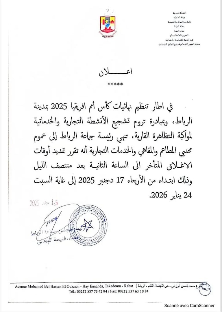 Cette mesure entrera en vigueur à compter du mercredi 17 décembre 2025 et restera applicable jusqu’au samedi 24 janvier 2026, couvrant ainsi l’ensemble de la période de la compétition. À travers cette initiative, les autorités locales entendent accompagner la dynamique économique générée par la CAN, tout en favorisant l’animation nocturne de la ville durant ce mois marqué par une forte affluence.
