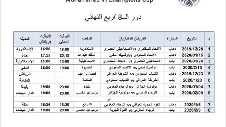 Quant au Raja, deux pistes sont prises en compte: si les Verts joue le MCA, l’aller se jouera à Blida, le 4 janvier à 20 heures, puis le retour à Casablanca, le 9 février à 20H. Si les hommes de Sellami jouent les Forces aériennes irakiennes, l’aller sera joué à La Mecque, le 6 janvier à 16H30, puis le retour le 9 février à 20H à Casablanca.