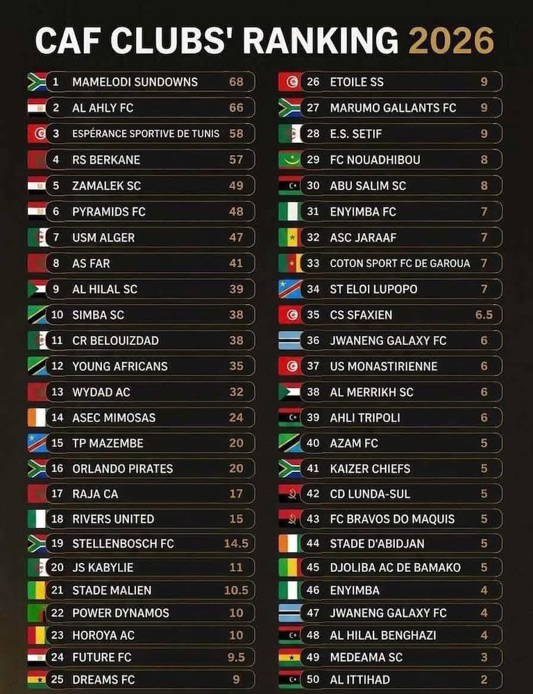 Au sommet du classement, les Sud-Africains de Mamelodi Sundowns dominent, suivis de l’incontournable Al Ahly, puis de l’Espérance de Tunis.