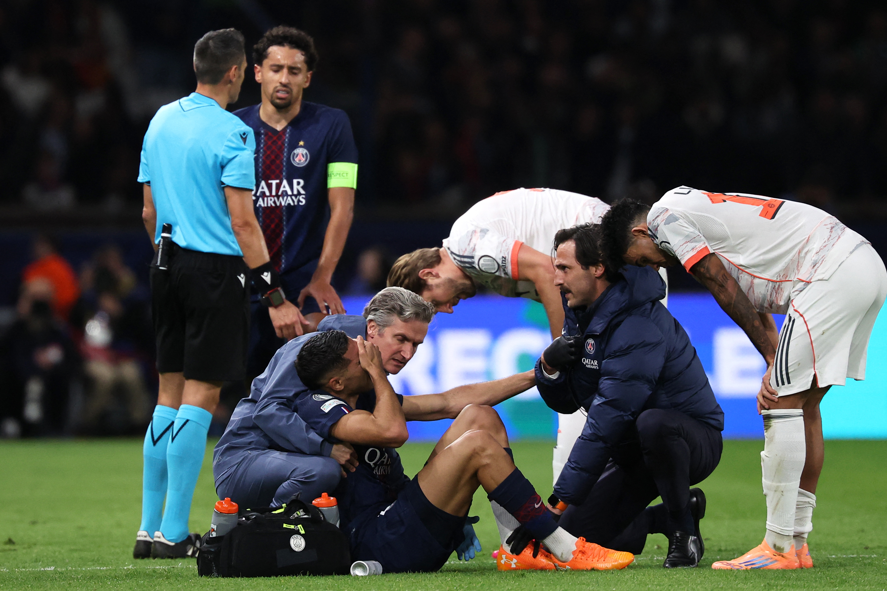 Achraf Hakimi est évacué après une blessure lors du match de la phase de groupes de la Ligue des champions entre le PSG et le FC Bayern Munich, disputé au Parc des Princes, le 4 novembre 2025.. AFP