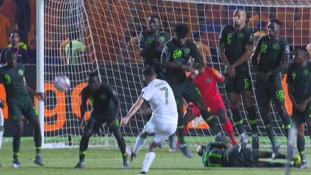 Rappelez-vous, le 14 juillet 2019. On joue alors la 95e minute du temps addtionnel lorsque l’arbitre de la demi-finale Algérie-Nigéria siffle un coup franc particulièrement dangereux pour les Fennecs. Après avoir un temps cru que le coup de pied arrêté allait être tiré par Youssef Belaïli, c’est finalement Riyad Mahrez qui s’en charge.