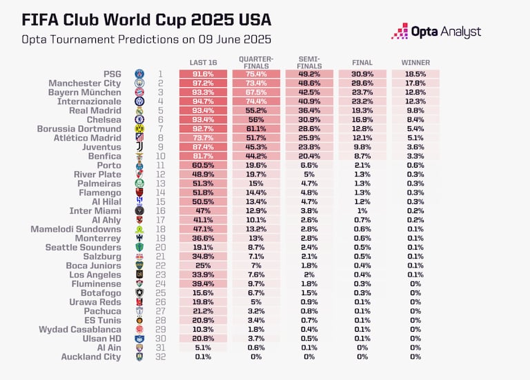 Le club qui a le plus de chance de l’emporter est le Paris Saint-Germain d’Achraf Hakimi. 91,6% de chances d’aller en 8es, 75,4% d’être présent en quarts, 49,2% de passer en demies, 30,9% d’être en finale et 18,5% d’être champions du monde.