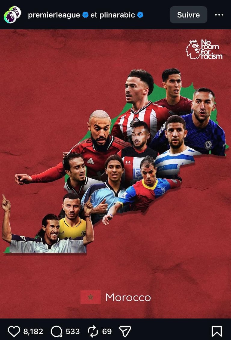 Le post mettait notamment en avant Noussair Mazraoui, Mustapha Hadji, Romain Saïss, Soufiane Boufal et Adel Taarabt, ainsi que d’autres joueurs marocains passés par le championnat anglais.