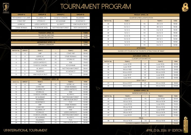 Le Maroc sera représenté par l’équipe de l’Académie Mohammed VI, mais aussi par le FUS de Rabat et la Renaissance sportive de Berkéne. Como 1907 (Italie), Aspire AC (Qatar), le Stade Rennais (France), Villarreal CF (Espagne), Vitória SC (Portugal), Leeds United (Angleterre), Boca Juniors (Argentine), l’AZ Alkmaar (Pays-Bas), Al-Ain FC (Émirats arabes unis), Nottingham Forest (Angleterre), Palmeiras (Brésil), l’AS Monaco (France) et le HNK Hajduk Split (Croatie) seront également de la partie pour une édition qui s’annonce relevée.