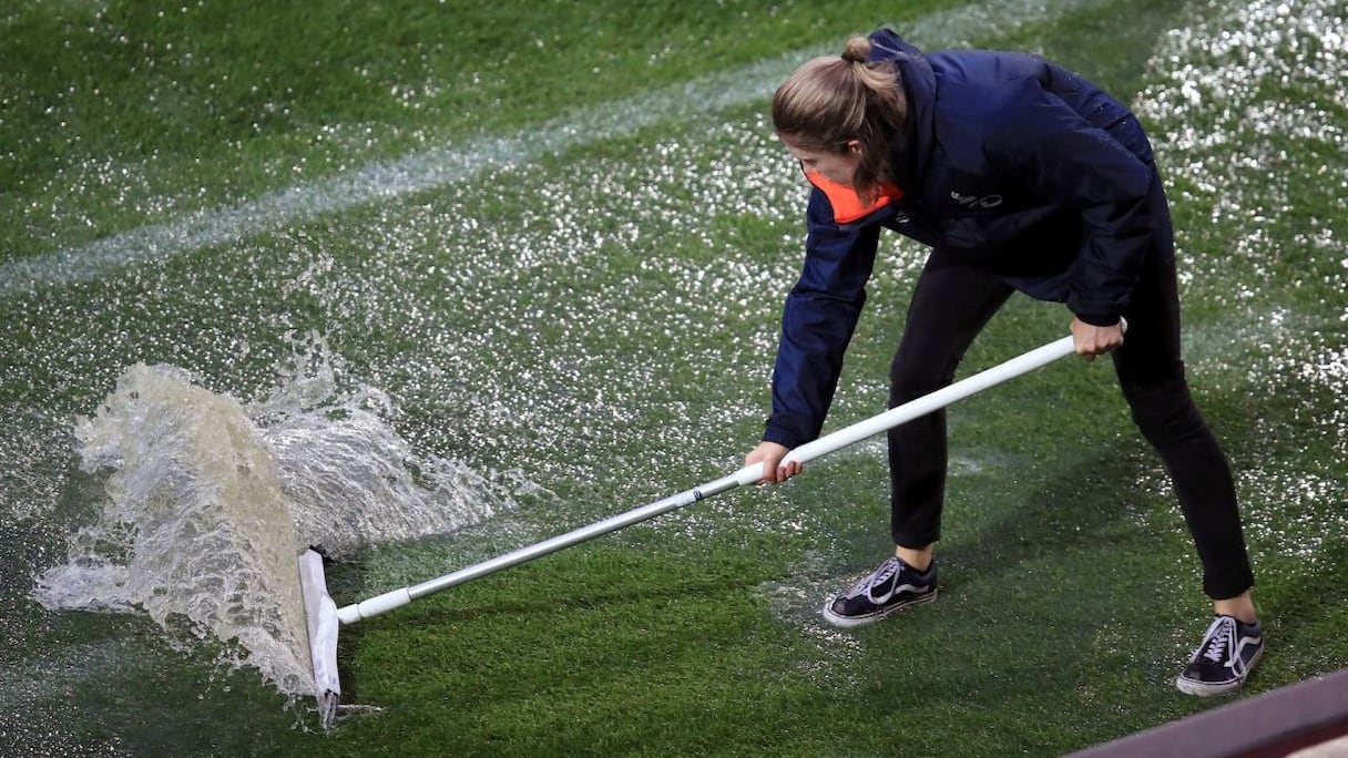 Cette fois-ci, la raclette et le seau ont fait leur apparition durant l'Euro féminin 2017 qui se tient actuellement aux Pays-Bas. Le coup d'envoi des quarts de finale entre le Danemark et l'Allemagne a été reporté à cause d'une pluie diluvienne. Pour minimiser les dégâts, les organisateurs ont utilisé les "grands moyens".