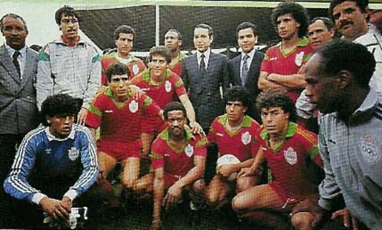 Le Roi Mohammed VI, prince héritier à l'époque, et Moulay Rachid, en compagnie des joueurs de la sélection nationale lors de la CAN 1988 organisée au Maroc