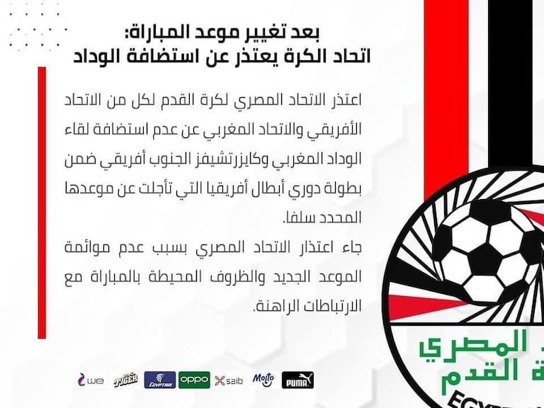 Alors que la Fédération royale marocaine de football (FRMF) avait trouvé un accord avec son homologue égyptienne pour disputer le match le 19 février prochain au Caire, les dirigeants du football égyptien ont finalement refusé d'accueillir cette rencontre.