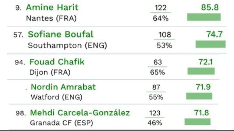 Sofiane Boufal (Southampton) est 57e du classement, Fouad Chafik (Dijon) est 94e, Nordin Amrabat (Watford) est 96e et Mehdi Carcela (Grenada) est 98e. Afin d’établir ce classement, le nombre de dribbles tentés par ces joueurs a été divisé par le pourcentage de dribbles réussis.